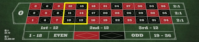 この出目の偏りが11ゲーム以降も継続すると考える場合は、「10,11,12,13,14,15」のエリアに集中的にダブルストリートベットします。