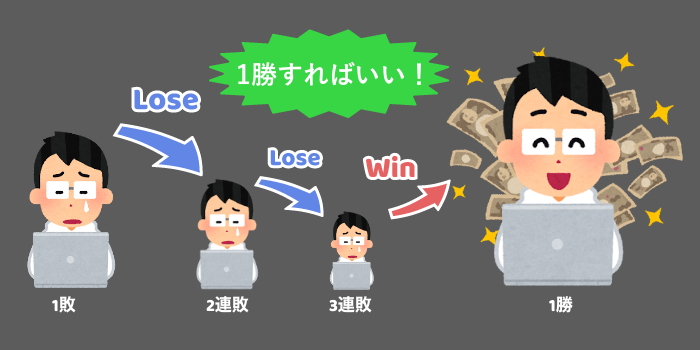 最大の特徴は14ゲームのなかで1度でも勝てれば必ず利益が出る点ですが、1勝で負け額全部を取り返して利益を出すマーチンゲール法ほどのリスクはありません。低リスクの資金運用で、着実に利益増を狙います。